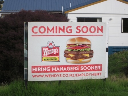 A large sign on the vacant lot on the corner of Bow St and Bankart St announces the coming arrival in Raglan of Wendy’s, the American the fast food giant. The property at 1 Bankart St was cleared a few years ago for a multi-storey development that never went ahead. Recently, local real estate agent L J Hooker has had the land for sale, but there have been no takers.