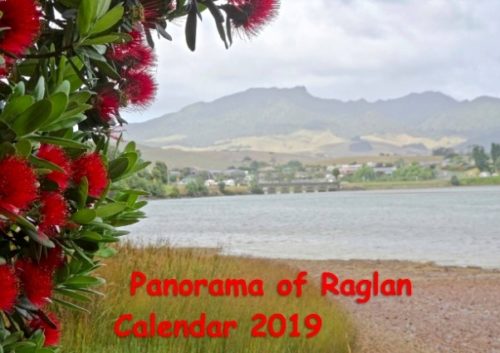 The ‘Panorama of Raglan calendar 2019’ is now in Raglan Bookshop on Bow St, Whaingaroa Organic Kai in Electric Lane, Bow St Gallery and Te Uku Store. The price is still $15, as it was when the 2009 calendar started off the publication.