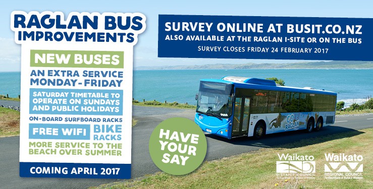 Busit, the council agency responsible for providing the Raglan-Hamilton bus service, has put a survey up online asking questions on user needs. After much prompting by bus users and our councillors on the Waikato Regional Council the council has at last decided to ask its customers what they would like. The survey is open 24th February. It is also available at the Raglan i-SITE and on the bus.