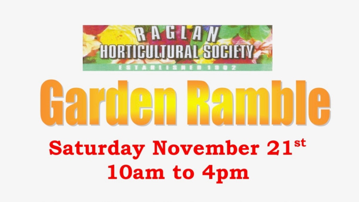 Raglan Horticultural Society presents a Raglan Garden Ramble. Saturday November 21st from 10am to 4pm. 10 very different gardens will be open to visit,