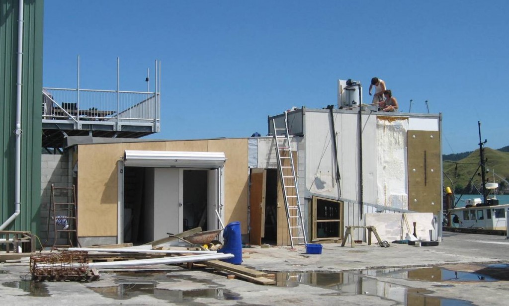Since April, Raglan Wharf has had no ice plant or cold storage. The major fire on April 13 destroyed the cold room and knocked the ice plant out of action. Initially commercial fishing operators and local iwi waited for the Waikato District Council, owner of the wharf, to get these facilities up and running. But when after eight months of waiting, Mark Mathers was told that it would be quicker if he did it, that’s just what he did. Mark as owner of Raglan Seafoods and also a Raglan builder knew just what was needed, so when WDC had approved his plans he started work immediately and the replacement facility is nearing completion.
