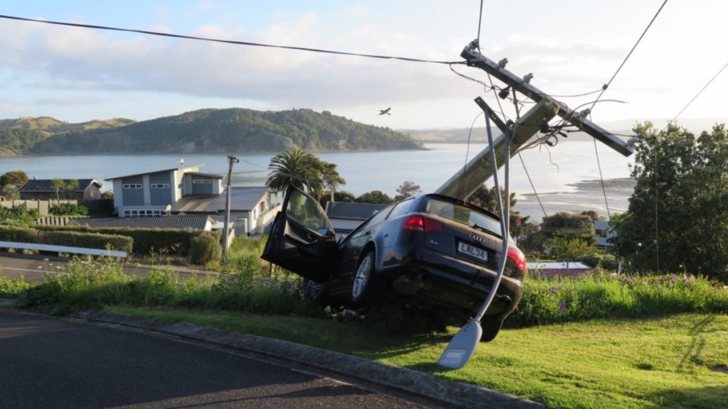 A one-car crash with a power pole on the corner of Bay View and Cambrae Roads woke residents in the early hours of Friday 27th December. The crash brought the power pole with power and telecom cables onto the road. The driver and the passenger were not injured.