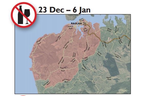 However, in Raglan over the busy summer period the usual central township ’no liquor’ area is extended to a large surrounding area from 23 December to 6 January.