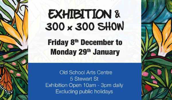 The Arts Weekend Exhibition and 300 x 300 Show will be open daily from Friday 8 December until Monday 29 January (excluding public holidays), between 10am and 3pm at the Raglan Old School on Stewart Street.