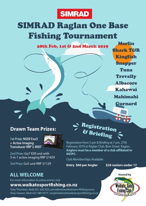 The Waikato Sport Fishing Club is proud and excited to announce the Raglan One Base is organised and ready to go! The Raglan Club, Bow Street are graciously hosting our tournament again this year at their great venue.