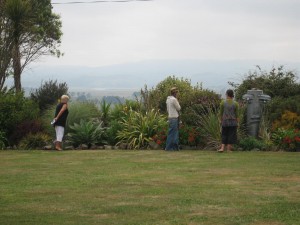 Like many of the gardens the artwork at Brenda Lichtwark and Nigel Stiles garden added an interesting touch set off by the backdrop of the inner harbour on one side and Mount Karioi on the other.