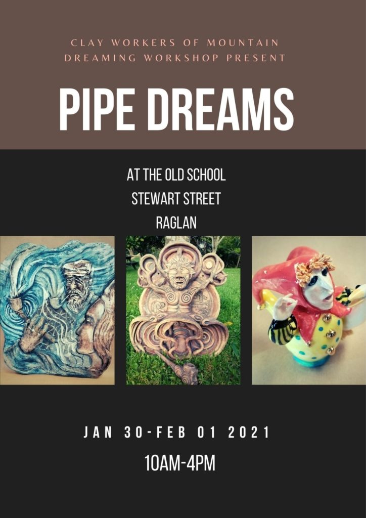 Pipe Dreams arise from nine artists who work at Mountain Dreaming Arts Workshop with Susan Flight. At Raglan Old School Arts Centre, 5 Stewart St, Raglan 10am to 4pm daily, Saturday 30th January and will run for 3 days until February 1st.