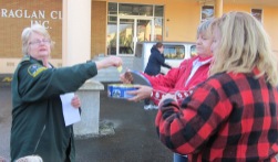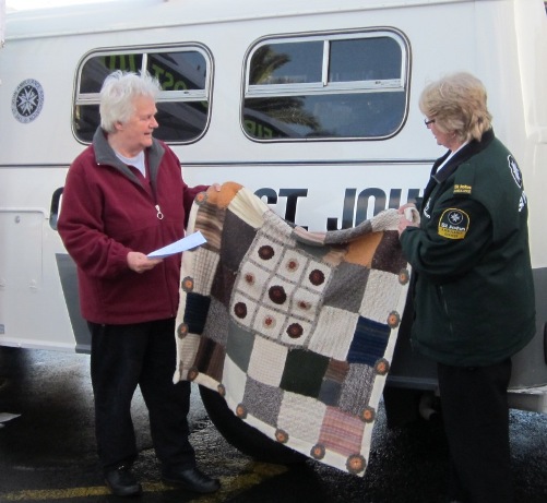 The Blacksand Cafe Wednesday knitters made sure that Saturday’s St John fundraiser in Bow Street got off to a good start. The knitters had created a rug which they then raffled with the proceeds being donated to Raglan St Johns. The knitters donated $335 to Raglan St John. The St John Area Executive officer drew the raffle winner who was Luise Eisenbaum.