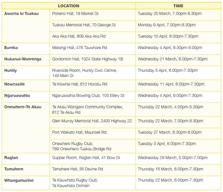 The schedule of sessions includes more than one in different parts of the district, but not at the same place. So, for example, if Tamahere residents miss the first session on 15 March, the next closest information session would be at Matangi Hall in the Council’s Eureka Ward on 4 April at 6.30-8pm.
