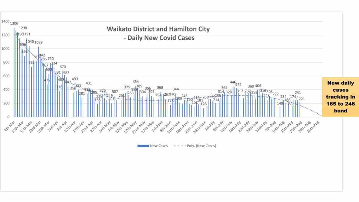 For our graph we have combined new daily cases numbers in Hamilton City, Raglan and other Waikato District areas (e.g. Tamahere, Whatawhata, Ngaruawahia, Huntly and Gordonton). Starting from a high level of over 1200 daily cases in early March, the numbers plateaued at about 1000 then began to slowly drop down to just over half the peak to 785 on 25th March. After tracking at about 200 a day in early May, they then went up to 350 a day, and then dropped to around 195 a day. They moved up in July to around 382 new Covid cases each day and are now steady at about 200 a day.