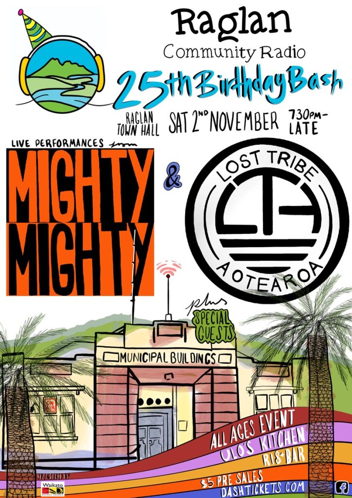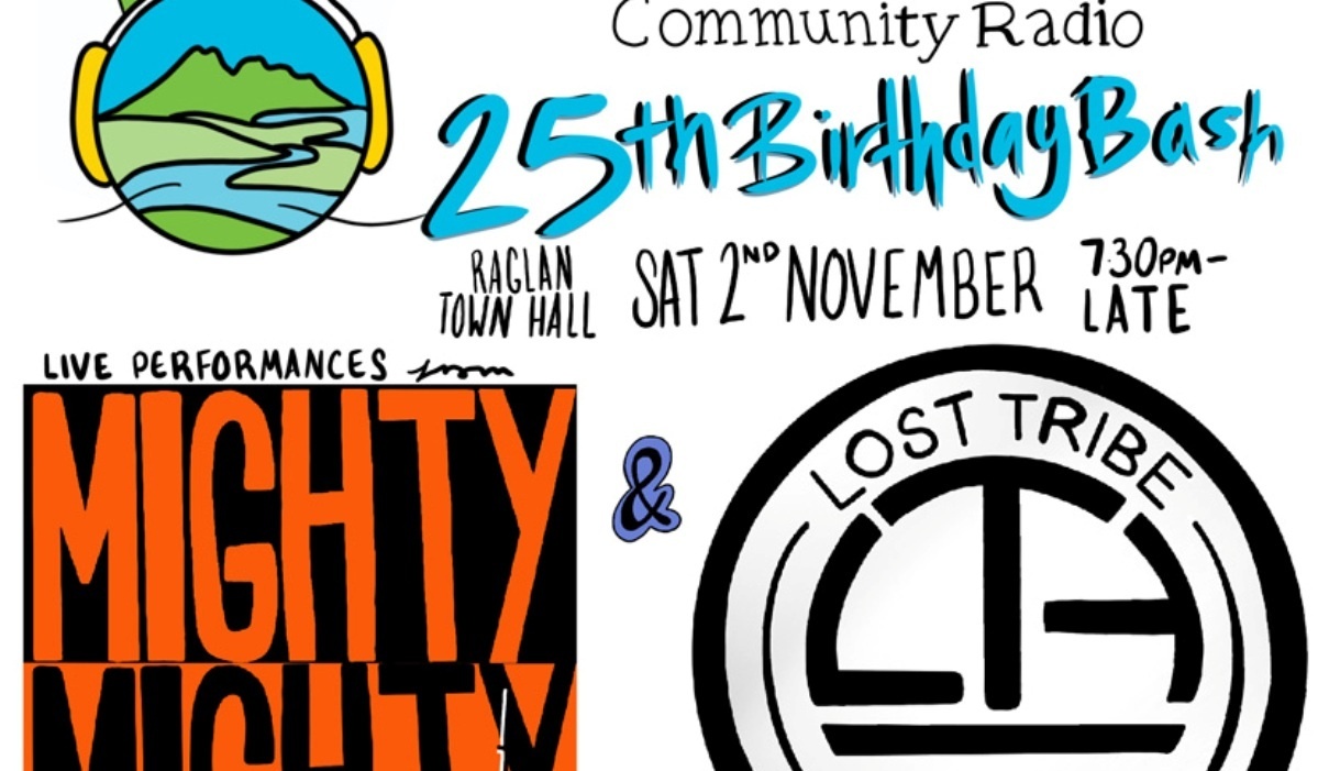 Raglan Community Radio has announced the biggest event in it’s 25 year history! It’s their 25th birthday celebration in the Raglan Town Hall on 1st November. A dinner for past and present DJs will be held early in the evening and then the doors will be thrown open to the public at 7pm for a concert that will include local legends Mighty Mighty, Lost Tribe Aotearoa as well as yet to be named Special Guests.