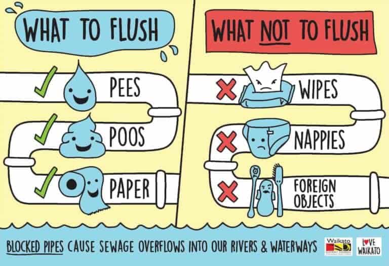 well done WDC for sending the message. Do NOT put anything down the toilet except the 3 allowables of poos, wees and paper. Anything else will contribute to blocked pipes, damaged pumps and overflows of sewage into the Raglan Harbour where you and your kids swim. DONT DO IT.