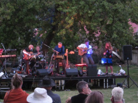 Raglan group Acoustic Spirit won over the audience at last night’s outdoor concert on the green behind the Old School Arts Centre. Playing everything from Greensleeves through to modern numbers local guitar maestros Dave Maybee and Peter Skandera along with fiddle & viola player Julie Pescud, Sid Limbert (bass guitar) and Bruce Dennis (Drums) gave a capitivating and enjoyable show.