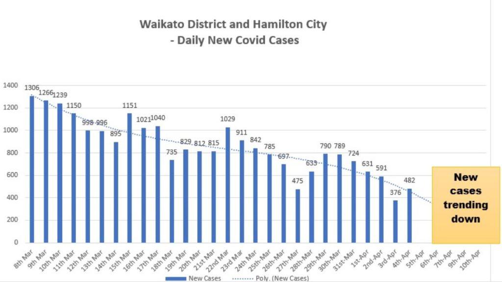 Raglan and Waikato District Covid cases are now down to 482 for Monday 4th April, with an average of just under 500 new cases each day. The downward trend is continuing. For 5th April the first day when Vaccine Passes are no longer required in most facilities new cases may be down to 400. While this is encouraging it is still a high level of cases.