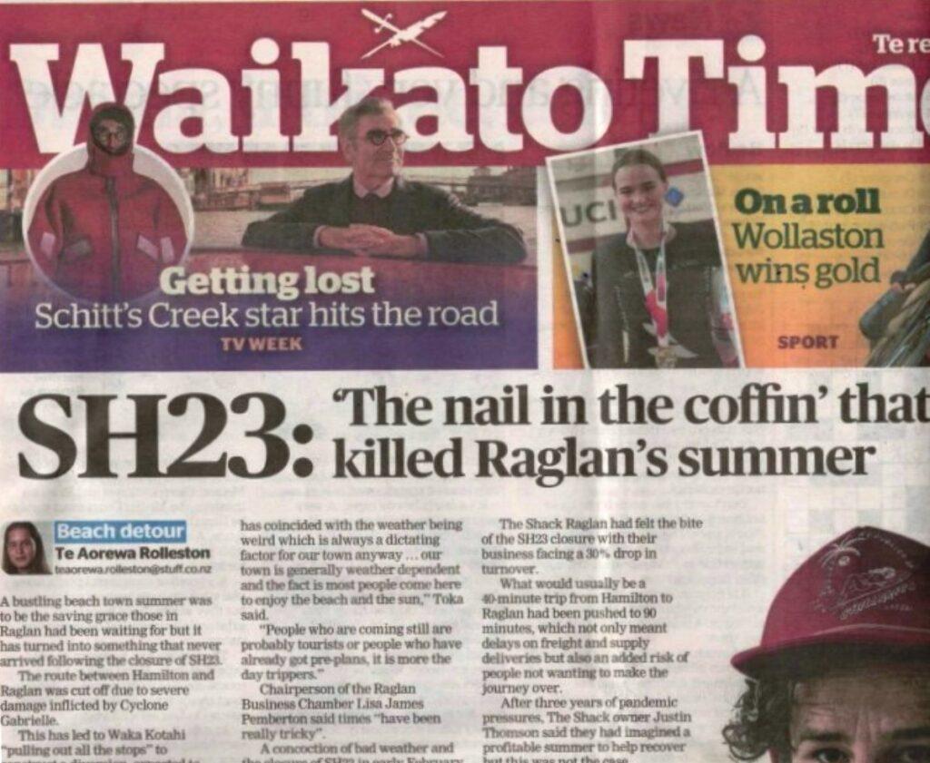 The Waikato Times article covered how a café owner in Raglan’s main street had shut down due to a lack of customers. The Raglan Business Chamber reported that visitor and customer numbers were down. Especially affected were day visitors from Hamilton and the central Waikato. Until the road reopens businesses are cutting costs and using cash reserves or overdrafts to keep going.