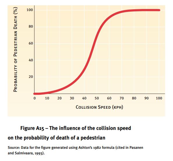 WDC plans a consultation period in Oct-Nov, linked with 40kph speed limit proposals for most of Raglan. John Lawson of Whaingaroa Environmental Defence says that by then a lot of work will have been done. So he asking people, “What do you think now? Would you like a WED meeting to discuss the options?” This graph shows the reason for 40kph (from page 27 of Transport Ministry paper) – would 30kph be better?