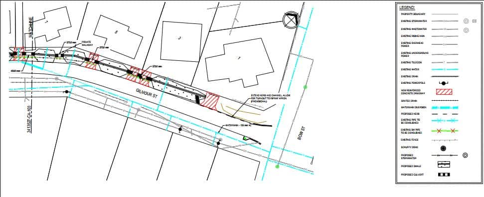 Mr Pavlovich has supplied storm water project plans for Gilmour Street covering two options, estimated to cost anywhere from $329,000 to $686,700. He has supplied the draft plans that the Council currently have on the storm water upgrade. He has asked people to take a look, get together and get your thoughts down on what can be done or what you would like to have done. He added, “The design criteria and design may change now that it is part of a wider package (involving a full road renewal).