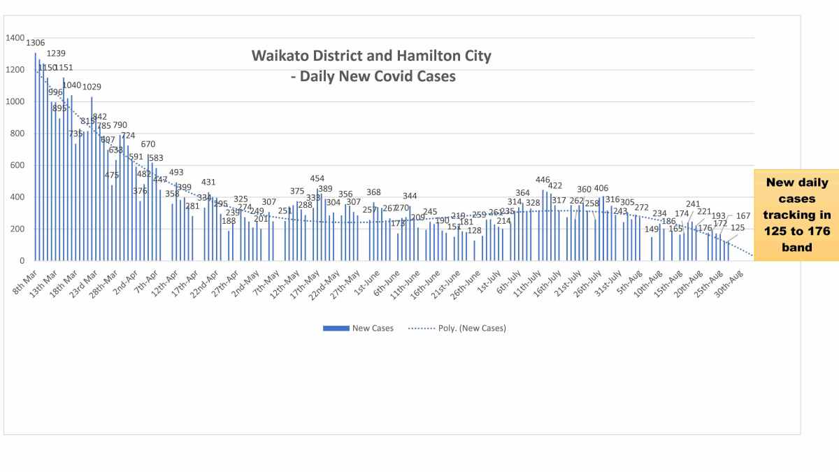 For our graph we have combined new daily cases numbers in Hamilton City, Raglan and other Waikato District areas (e.g. Tamahere, Whatawhata, Ngaruawahia, Huntly and Gordonton). Starting from a high level of over 1200 daily cases in early March, the numbers plateaued at about 1000 then began to slowly drop down to just over half the peak to 785 on 25th March. After tracking at about 200 a day in early May, they then went up to 350 a day, and then dropped to around 195 a day. They moved up in July to around 382 new Covid cases each day and are now declining at about 150 at about 200 a day.
