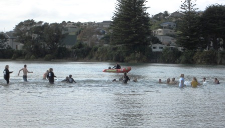 In conjunction with snow on the beach, the annual Raglan mid-winter swim took place with many adults and children plunging into the chilly water and swimming out to be first to get the ball. the mid-winter swim was sponsored by Ray White Raglan Real Estate. Chef de Mission Dave Currie gave the word to go and provided a commentary on the action. When the swimmers returned to shore Dave Hanna presented the prizes.