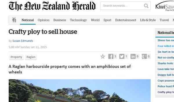 Today’s Sunday Herald features a Te Akau home being sold with what the Herald describes as a ‘crafty ploy’. The partly finished luxury home on Te Akau Wharf Road comes with a free brand new Sealegs 6.1R amphibious marine craft. Driving to Raglan can take about an hour, but the purchaser of this property, will be able to make it to Raglan in about five minutes thanks to a brand new Sealegs 6.1R amphibious marine craft, valued at more than $100,000. The offer is in collaboration with Sealegs International, an Auckland company which makes the amphibious vehicles.