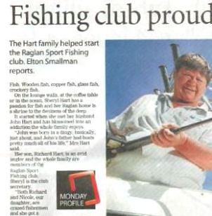 The article by Elton Smallman on the Hart family covered John and Sheryl Hart passion for fishing and how they set up the Raglan Sport Fishing Club in the year 2000. It covers the great community work the Club has done improving the Te Kopua launching ramp and establishing the Manu Bay launching ramp.