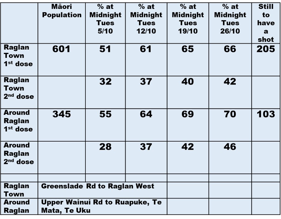 The numbers for people having their second jab was better with a two percent increase. To date the percent fully vaccinated is: Raglan 60%, Around Raglan 58% and Te Akau 66%.