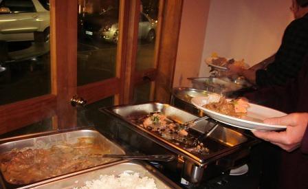 Doors open at 5pm with the buffet served from 6pm. Last night the meal began with a soup of orange, carrot and coconut along with toasted slices of baguette. After that the main buffet featured stuffed roast pork, oven baked salmon, chicken with cashews plus some others that I didn’t manage to sample. Next for dessert came a choice from six dessert creations by Stan. I tried two of them, the cheesecake and the chocolate cake. Delicious.
