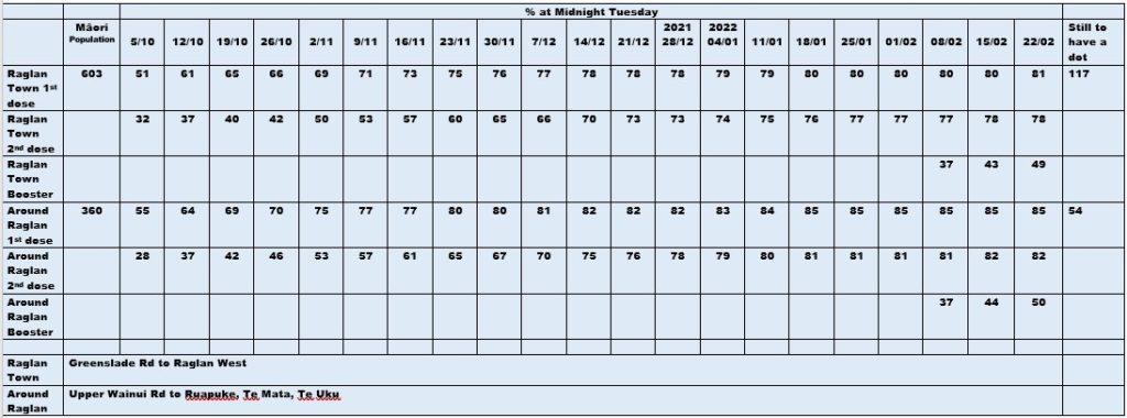 Good progress has been made with the 5 to 11 year age group. First dots completed are; Raglan 34%, Around Raglan 36% and Te Akau 40%.