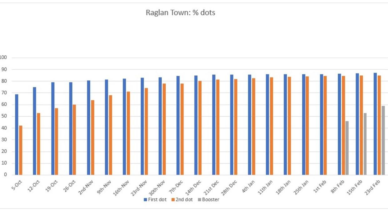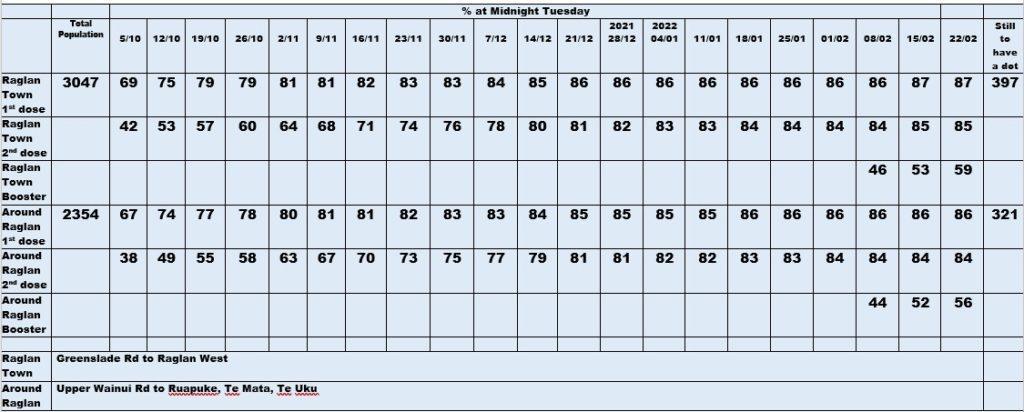 Data released by Waikato DHB on 23rd February shows that good progress has been made with Whāingaroa residents receiving the covid booster vaccination. Sixty percent of the population have now had a booster. While progress on boosters has been very good, double vaxxed progress is flat at 87%. There are 20% of the local population who have not had their first dot. This works out to be 479 unvaccinated people.